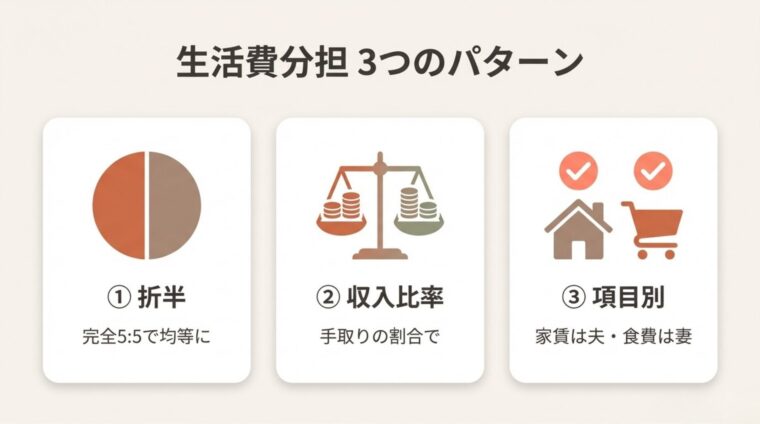 共働き夫婦の生活費分担には、大きく3つのパターンがあります。順番に解説していきます。