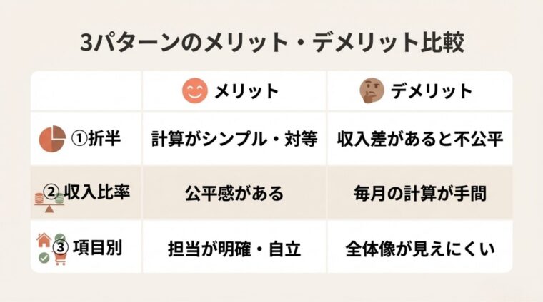• 折半・収入比・項目別の3パターンのメリット・デメリット