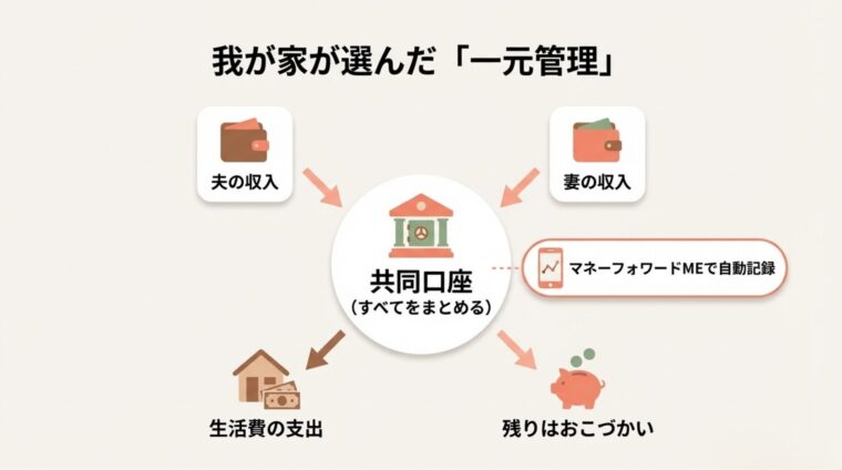 一元管理とは、2人の収入をすべて共同口座に集めて、そこから必要なものを引き出すやり方です。いわゆる「おこづかい制」に近い形です。