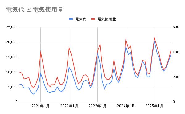 2020年4月〜2025年8月の電気使用量をまとめました。
