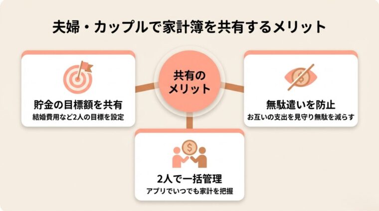 夫婦・同棲カップルで家計簿を共有するメリットは以下の3点です。