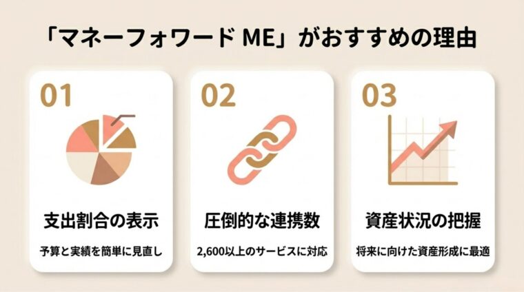 家計簿アプリは「マネーフォワード ME」がおすすめな理由として、以下の3つを紹介しました。
