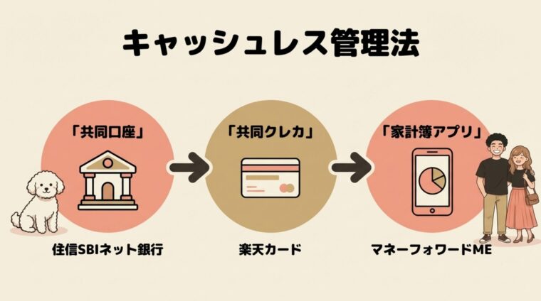 試行錯誤の末にたどり着いた答えは、共同口座・共同クレカ・家計簿アプリの3つを組み合わせたキャッシュレス管理です。